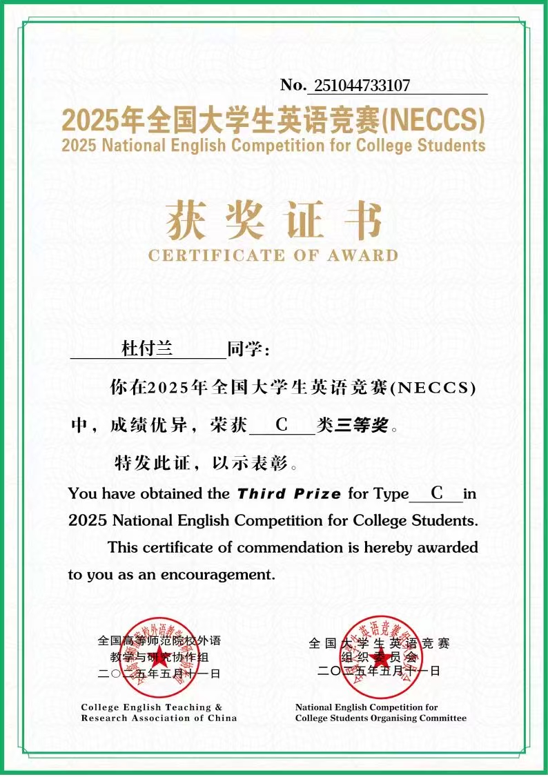 为检验老员工的英语综合应用能力,提升员工的英语学科素养,2025年全国老员工英语竞赛(NECCS)顺利举办,该赛事是高校英语领域的重要竞赛之一。 基于公司员工资助政策的扎实推进,公司家庭经济困难员工2022级7班杜付兰同学在竞赛中表现优异,荣获C类三等奖。在学院、学校和国家的资助政策支持下,她持续提升英语听读写译综合能力,认真备赛应赛,最终在赛事中斩获佳绩。 本次获奖展现了公司员工的英语综合素养,也将激励更多同学重视语言能力提升,积极参与学科竞赛锻炼自我。
